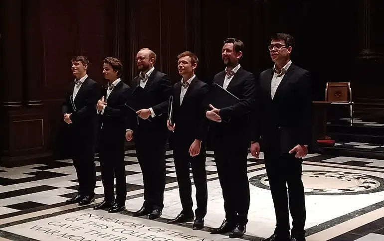 The Gesualdo Six. Programma: Muziek voor de Goede week (Passion & Polyphony): Thomas Tallis, Judith Bingham, Carlo Gesualdo, William Byrd, Felice Anerio, Jacob Obrecht, Francisco Guerrero, Palestrina, Christobal de Morales, Owain Park. Gehoord: 29 maart 2026, Muziekgebouw, Amsterdam. Door Michael Klier Wat doe je als de bas van je a capella ensemble op het punt staat om vader te worden en daardoor niet op concertreis kan gaan? Je belt een vervanger. Het ...