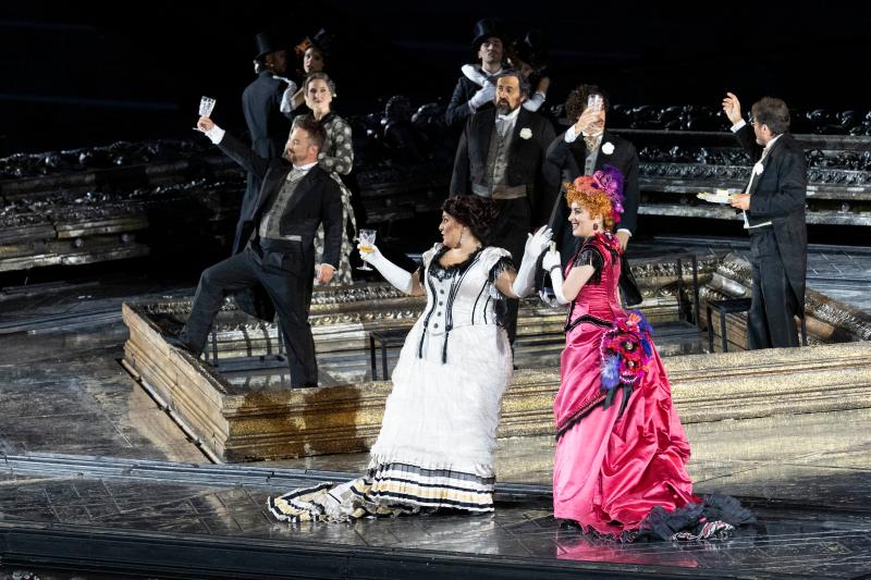 Giuseppe Verdi: La traviata. Koor en orkest van de Arena di Verona o.l.v. Francesco Ommasini. Met Gilda Fiume (Violetta Valéry), Sofia Koberidze (Flora Bervoix), Galeano Salas (Alfredo Germont), Ludovic Tézier (Giorgio Germont) e.a. Regie: Hugo De Ana. Gehoord: 2 augustus 2025, Arena, Verona