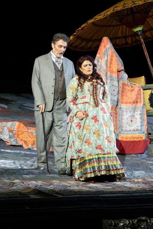 Het Zigeunerinnenkoor is een beetje mat maar ziet er goddelijk uit, met veel pruiken, die alles zoveel mooier maken, zeker in de dimensies van de arena. Het Matadorenkoor is vurig, maar de confrontatie tussen Alfredo en zijn ex is eigenlijk te zacht en te lief, hoewel Germont de akte redt met de cynische afwijzing van zijn zoon, en het koor, door Ommasini uiterst helder en kundig gedirigeerd, zingt een hartverscheurend troostlied voor de gebroken Violetta, die haar verdriet ragfijn, superzacht maar zeer indringend door de enorme ruimte laat zoemen. Het publiek hield de adem in – een werkelijk schitterend en huiveringwekkend moment. Wat zou ik deze beide zangers, Violetta en Alfredo, graag eens in de zaal willen horen, want hun schitterende stemmen passen niet alleen perfect bij deze rollen, maar ook bij elkaar.