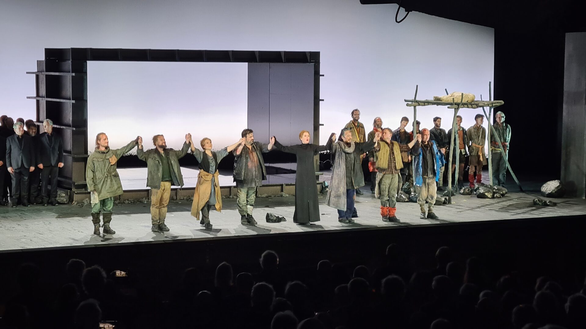 Audi’s toneelbeeld werkt in de eerste akte heel goed (geholpen door de mooie kleding), en geeft inderdaad alle ruimte aan muziek en verhaal, hoewel de liefdesscène na het drinken van het elixer wel een knuffel had kunnen gebruiken, maar ja: ik begrijp dat dat tegen het regieconcept is. Ook had de fakkel, waarvan in de tweede akte vaak sprake is, niet misstaan en de ontdekking van het overspel, door een klein gordijntje op te halen, was wel érg minimalistisch. Het licht bleef erg lang grijs en grauw (het patent van belichter Jean Kalman), maar het was vooral de ogenschijnlijke liefdeloosheid tussen de beide hoofdpersonen die nog het meest opviel: Wagners zinderende liefdesteksten werden over de volle breedte van het toneel, zo’n 25 meter, naar elkaar toe gezongen zonder dat er enige wederzijdse aantrekkingskracht te bespeuren was. Natuurlijk, in de kern draait Tristan om de onmogelijkheid van aardse liefde en het verlangen naar een totale, mystieke versmelting die alleen in de dood bereikt kan worden, maar was die misschien niet nog treffender geïllustreerd door er eerst een flinke omarming (of meer?) aan toe te voegen? Nu waren de geliefden vanaf de eerste seconde al onbereikbaar voor elkaar, en wekten ze nergens de indruk veel interesse in de ander te hebben – er gaat dan iets verloren wat we als toeschouwers nog niet eens hebben kunnen beleven. Het slotbeeld was echter prachtig: Isolde die door het sterke tegenlicht bijna onwaarneembaar wordt, en opgaat in de dag die ze zo verafschuwt, omdat hij symbool staat voor de harde werkelijkheid en het verraad. Hier was opgaan in het duister misschien voor de hand liggender geweest: opgaan in de droom, in de wereld van geheimen en de ‘verduistering van het bewustzijn’ – of zoals Tristan het zegt: Het verlangen dat nooit sterft, smeekt nu om de vrede van de dood.
