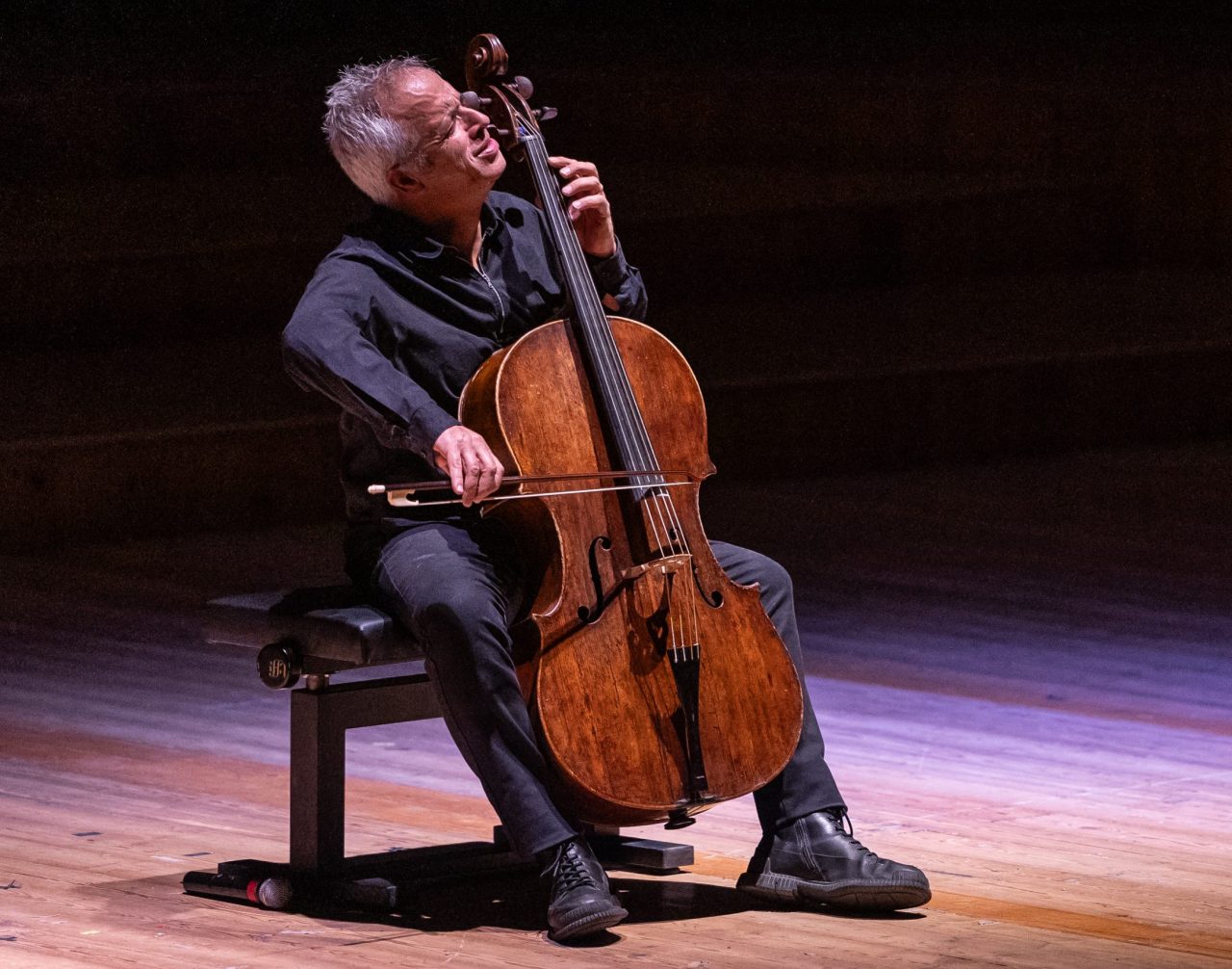 Midden in het programma speelde hij een Suite van Bach (‘Not all six’ voegde hij eraan toe!), de Eerste suite. Vreemd genoeg klonk daarbij de Prelude gekunsteld, anekdotisch en stroomde de muziek niet door missende lange lijnen, maar in de overige delen herstelde hij dat met spel dat rust en schoonheid uitstraalde. Het was heel fijn om een hele cellosuite van Bach te horen en niet een enkel deel. Sollima had diverse strijkstokken bij zich, waaronder een hele kleine, waarmee hij op de snaren sloeg. Verder zag ik hem zakendoen die ik nog nooit eerder van een cellist gezien heb: hij streek met zijn onderarm over de snaren of kraste er zelfs met zijn nagels overheen! Dat werd afgewisseld met zaaggeluiden en in de hitte van zijn spel bleef zelfs even de strijkstok vast zitten! Tussen de laatste twee onderdelen stemde hij zijn cello en toen hij niet eens ‘speelde’, haalde hij ongelooflijk diepe klanken uit het instrument. Het moet gezegd worden: Sollima is soms een mafketel, maar wel een geniale mafketel!