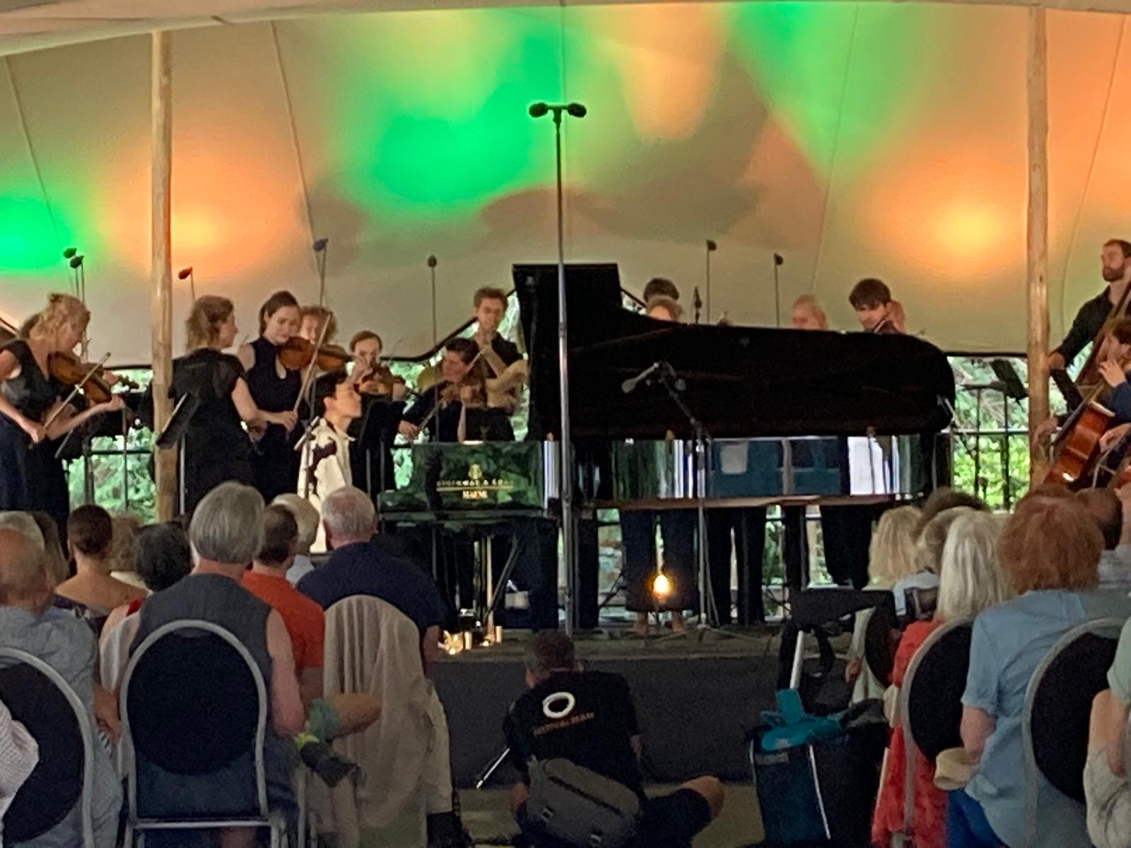 Het eerste concert dat ik bijwoonde, was het recital van meesterpianist Alexander Gavrylyuk. Op het moment dat hij speelde, was het heel warm, dus het zal voor hem in zijn pak met hooggesloten kraag een nog grotere inspanning dan anders geweest zijn. Hij begon zijn concert met Mozarts Sonate in c KV 330, waarbij hij het eerste deel in een bijna ideaal tempo inzette. Zijn spel klonk nog wat ingehouden, alsof hij zich qua expressie niet helemaal durfde te geven. Bij mijn weten was de vleugel niet versterkt, maar het klonk prima, ondanks het vrolijke gekwetter van vogels op de achtergrond. Het tweede deel straalde door zijn eenvoud rust uit, terwijl hij het derde deel in een snel tempo nam. Daarna volgde de Fantasie in f opus 49 van Chopin, waar hij de inleiding vrij snel nam, wat iets van het statige karakter van deze kleine ‘marche funêbre’ weghaalde. De pianist ging trefzeker te werk in de beruchte akkoorden, waarbij de handen over het hele klavier uit elkaar gaan. ‘Zo!’, zei een meneer achter mij bewonderend na het slotakkoord. Nog meer reden voor bewondering was er voor zijn vertolking van de Schilderijententoonstelling van Moussorgsky. Daarbij schuwde Gavrylyuk geen uitersten in dynamiek. Hij begon Bydlo direct forte, daar waar veel pianisten geleidelijk de dynamiek doseren. Op een bepaald moment werden zijn fortissimo’s erg luid, maar het diminuendo aan het eind was mooi. Het ballet van de kuikens in hun eierschalen klonk ‘crisp’ zoals de Engelsen dat zeggen en er waren tal van verfijnde details, zoals de geraffineerde tremolo’s aan het eind van Catacomben. De Hut van Baba Yaga was als te voorspellen woest en in de Grote poort van Kiev toonde de pianist nog eens dat hij een groot virtuoos is, die zich aan het eind een beetje liet verleiden tot luid spel. De totaalindruk was er niet minder om en het publiek bracht de pianist direct een staande ovatie, die hij met de nostalgische Etude opus 2 nr 1 van Scriabin beantwoordde.