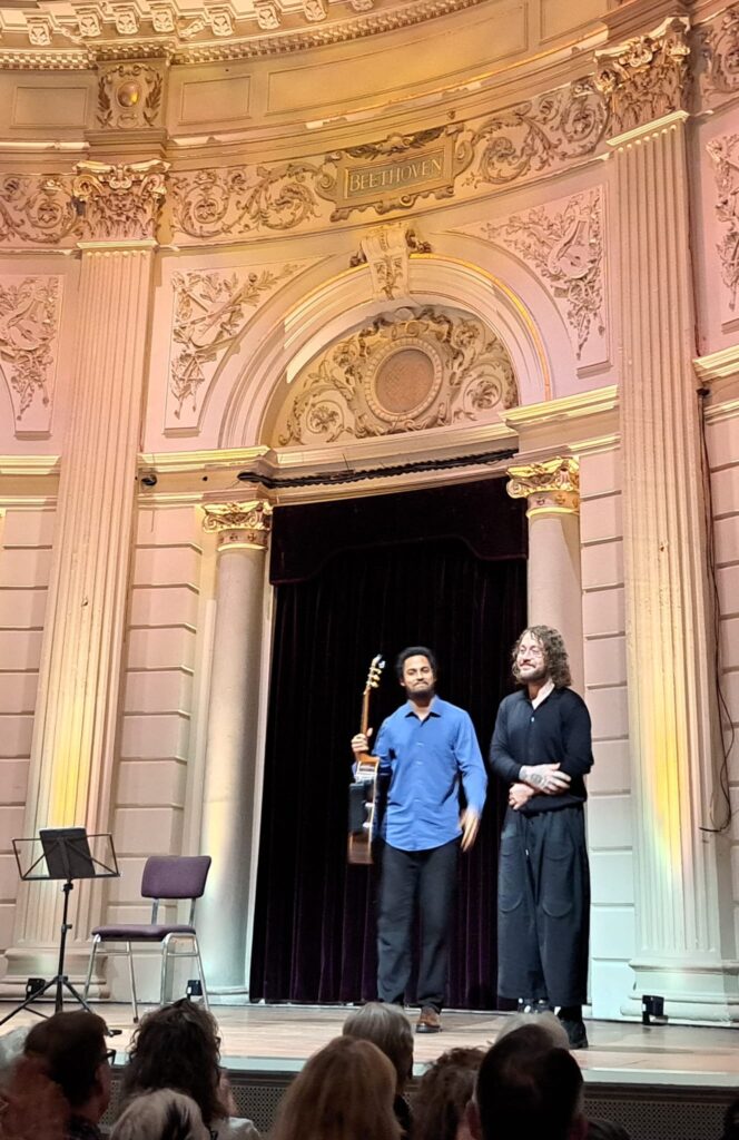 Door aanmoediging van familie en met financiële steun van de Braziliaanse overheid, vestigde Fernandes zich in Londen waar hij van 2014 tot 2020 studeerde aan de Royal Academie of Music en o.a. bevriend raakte met Sheku (cello) en Braihma (viool) Kanneh-Mason. Beiden spelen op de cd Saudade, die Fernandes maakte bij het platenlabel Decca, waar hij sinds 2021 onder contract staat. Toen covid uitbrak nam de familie Kanneh-Mason hem liefdevol op in hun muzikale huishouden. Toch kreeg de gitarist in Londen een identiteitscrisis en legde zich naast de Europeese- ook op de Zuid Amerikaanse muziekcultuur toe, om zichzelf weer terug te vinden. En van deze muziek konden wij in het Concertgebouw genieten.