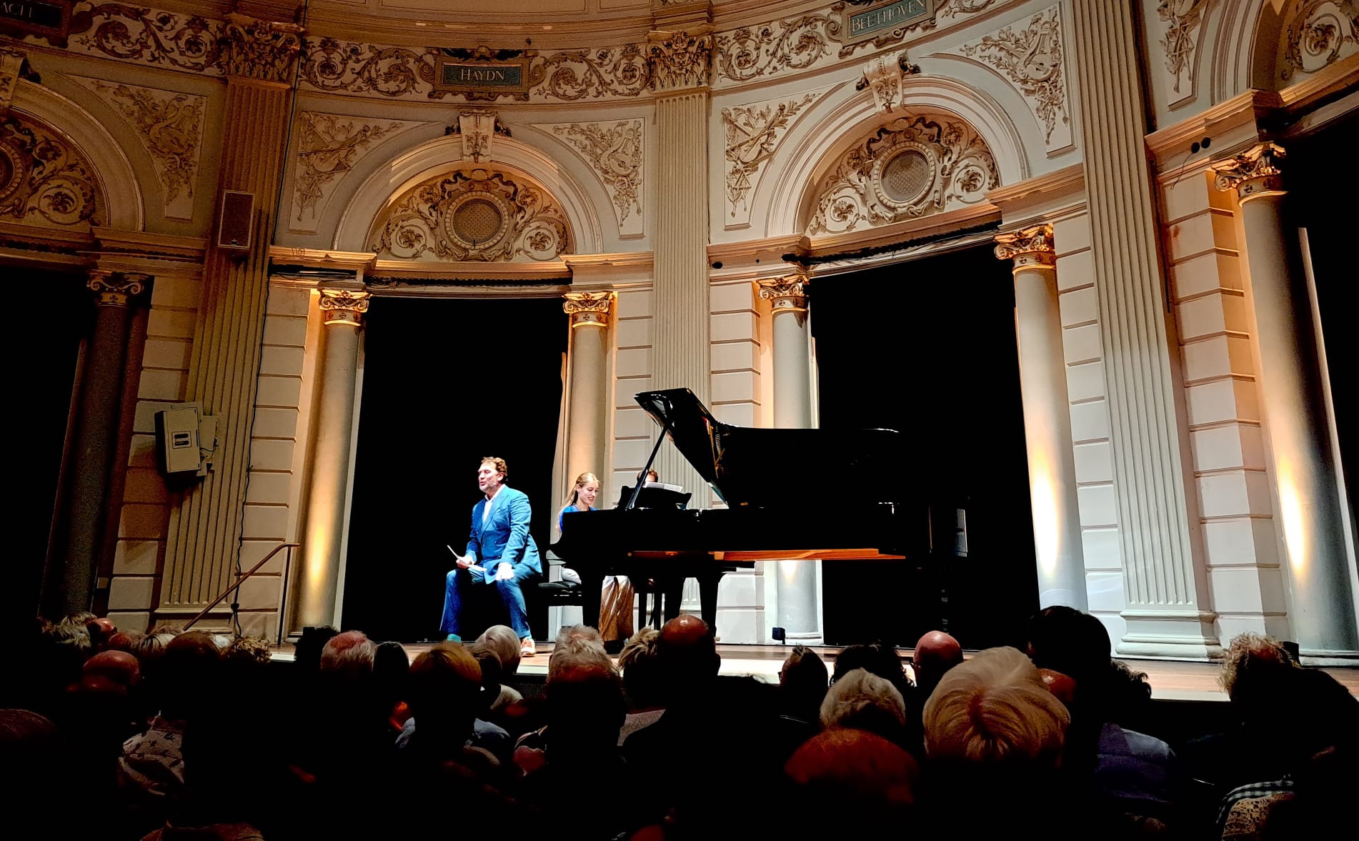 De zomeravond was bovendien zeer voelbaar aan de temperatuur, die in de uitverkochte kleine zaal letterlijk hoog opliep, waardoor de musici met hoogrode konen op het podium zaten en zichzelf zo nu en dan koelte toewuifden. Een ander onprettig en onbegrijpelijk minpunt van deze avond was dat er veel te weinig programmaboekjes en gedrukte liedteksten waren. Het eerste was ook online (op de telefoon) te vinden, maar over de gemiste liedteksten werd in de pauze flink geklaagd. Want terwijl de ene helft van de zaal luid zat te lachen, vroeg de ander helft van het publiek zich af waar de grap over ging. Echt een gemiste kans bij zulke leuke en weinig uitgevoerde liederen.