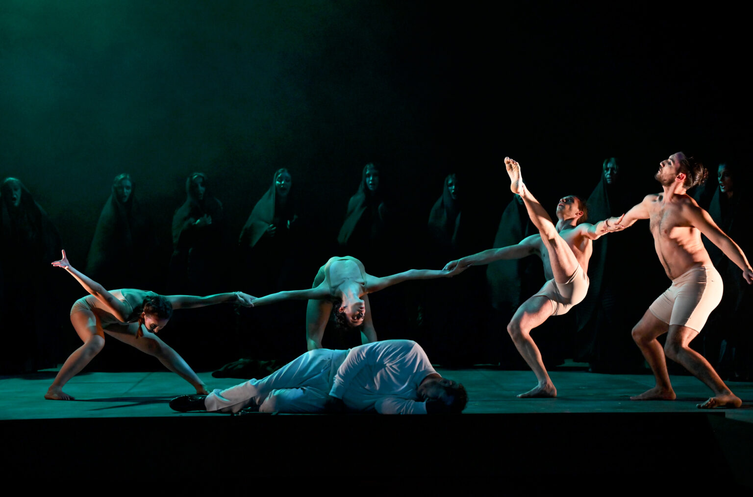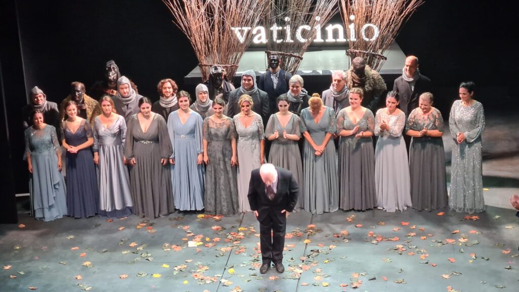 Regisseur Manuel Renga had de toch al piepkleine zaal nog eens verkleind door een extra toneel voor de orkestbak te bouwen, wat prachtig werkt maar in feite onnodig was: de zangers zitten ook zonder deze uitbouw al op je lip en staan de hele tijd bijna levensgroot voor je neus, wat deze voorstelling tot de meest ‘aanraakbare’ maakte die ik ooit zag. Er is ook nog een klein verhoogd podium in het midden, waardoor er veel mogelijkheden voor de over het algemeen sobere regie ontstaan, mogelijkheden die Renga met beide handen aangrijpt: Macbeths vreselijke nachtmerrie wordt er bijna tastbaar door, de geestverschijningen in deze donkere, bovennatuurlijke en magische wereld voelen eerder reëel dan symbolisch en de psychologische waanzin wordt nóg angstaanjagender. En ook al is de tweede finale in deze versie veel bleker dan die van de latere: de intensiteit van deze tegelijkertijd realistische en poëtische regie weet van begin tot eind te boeien, ja zelfs te beangstigen. Het ‘ballet’ van vier spookachtige figuren voegt veel mysterie toe aan de handeling, en wordt prachtig uitgevoerd – dat alles in een beklemmend decor waarin het woord ‘Vaticinio’ (profetie) als een onheilspellende boodschap, als een onontkoombaar noodlotsteken, achter alle hoofdrolspelers opdoemt.