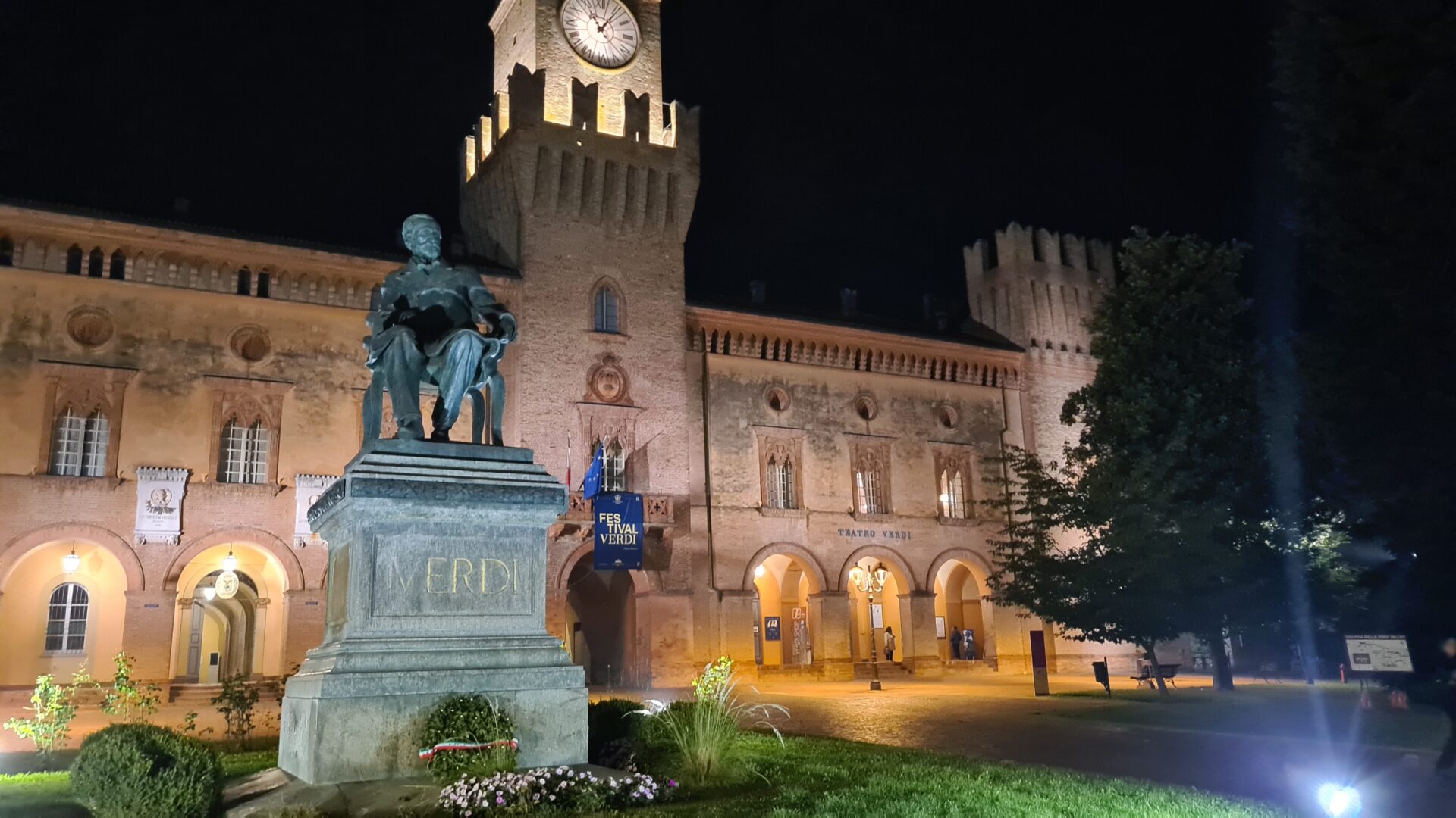 De zaal is een klein wondertje, een mini-kopie van een bonbonnière als de Scala, met een hoefijzervormige zaal, allerlei prachtige fresco’s en decoraties en maar liefst drie galerijen – vanaf de hoogste verdieping heb je nog steeds het idee dat je de zangers bijna kunt aanraken. Er is een kleine orkestbak en een verrassend goede acoustiek. In 1913 dirigeerde Arturo Toscanini hier Falstaff voor Verdi’s honderdste geboortejaar, en de decors van toen werden in 2001, Verdi’s honderdste sterfjaar, gerestaureerd en zijn nog steeds in gebruik. Ook in 2001 kwamen hier Franco Zeffirelli en Riccardo Muti met Aida en Falstaff. Het was een sensatie, maar ook nu: wie hier een zitplaats heeft bemachtigd, heeft het gevoel 150 jaar terug in de tijd te gaan en Verdi, ondanks alles, tegen het lijf te kunnen lopen en een praatje met hem te kunnen maken, hoewel hij dat waarschijnlijk beleefd zou hebben afgehouden – zeker met een recensent.