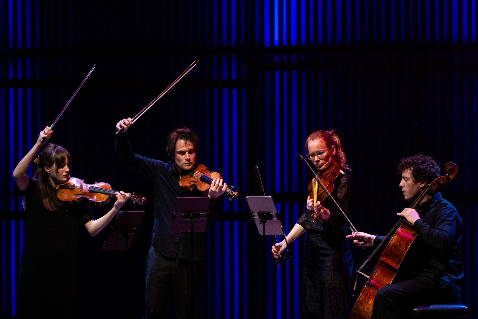 Het strijkkwartet was op het lumineuze idee gekomen om het gloednieuwe When the Sky Burns Red voor strijkkwartet en tanbur van de Iraans-Nederlandse componiste Aftab Darvishi te combineren met arrangementen van de madrigalen voor zangstemmen van Monteverdi, Ainsi le nuit van Henri Dutilleux en Tenebrae van Osvaldo Golijov, muziek die de wereldpremière van Darvishi’s indringende en heftige, maar ook tedere en poëtische stuk liefdevol omarmden. Zoals meer jonge kwartetten op de Biënnale, voerde het Animato Kwartet al deze werken staande uit, waarbij alleen de cellist en de tanbur-speelster noodgedwongen zaten. Monteverdi’s madrigalen ‘zongen’ sereen, in Dutilleuxs nachtelijke universum bewoog het kwartet zich in mysterieuze, flitsende, fluisterende en schrijnende klanken gracieus tussen hemel en aarde heen en weer, waarna de fascinerende muzikale reis werd afgesloten met de barokke baslijnen van Golijovs sfeervolle Tenebrae.